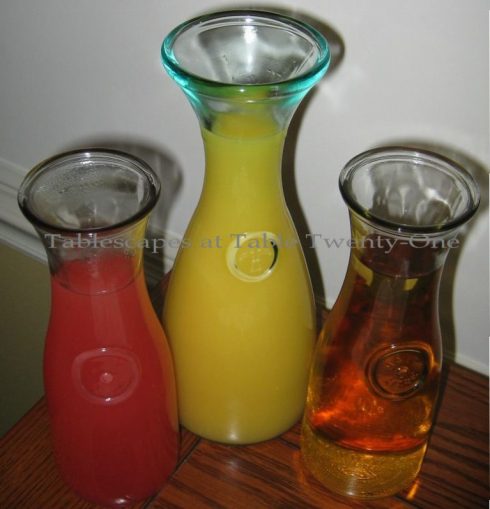 Nothing like a little fruit juice to get the day started! Here, clear glass decanters hold a choice of pink grapefruit, orange or apple.