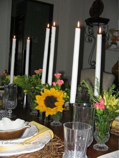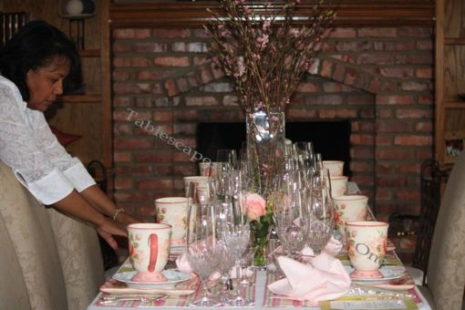 Each place setting consists of a beaded silver charger with platinum-rimmed Noritake “Spectrum” china, a monogrammed linen napkin, heirloom flatware (with rose detailing), Longchamps crystal, an authentic silver julep cup, and…for a bit of whimsy in an otherwise staid & traditional setting…a real horseshoe! If you use horseshoes atop fabric, be sure to wash them thoroughly in hot, soapy water then dry with a soft cloth. Allow to air dry for at least 2 hours to assure all moisture has evaporated so as not to rust and stain. These horseshoes were surprisingly affordable at just $2.39 lb. That’s quite a bargain!