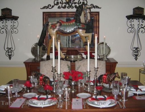A pair of beautiful show horse figurines from Hobby Lobby flank the center trophy of roses. I created the traditional “garland of roses” using red satin ribbon and rosettes like those used on the menus. (The real garland for the winning horse, of course, has more than 400 red roses!