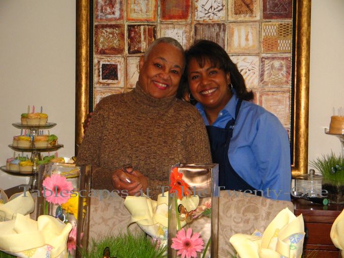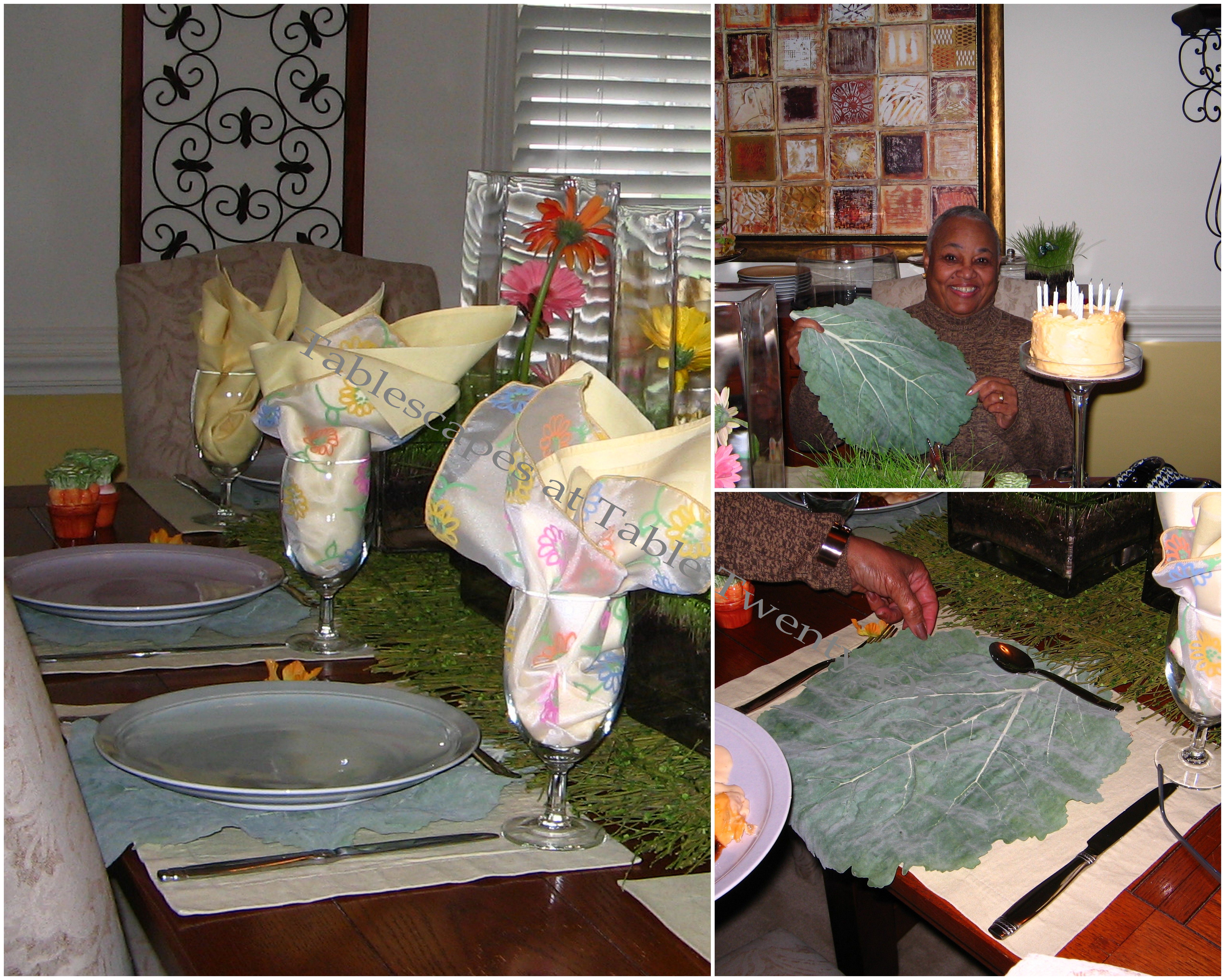 My Mom’s official birth date is March 22, so what better way to ring in the season than with a spring tablescape rich with the colors and elements we miss over the long, cold winter? Mom really got a kick out of my sudden “green thumb” with rye grass grown just for the occasion in clear glass containers. (She then tried to play it off…like, “Whatever, dude. No big deal. I could’ve done that with my eyes closed.” Look at that look on her face…and the one on mine!!! 🙂 🙂 🙂 ) Rye grass only takes a couple of weeks to look like this! See Tip #15 under the “Table Tips” tab above. Fresh Gerbera daisies add a playful and colorful element to the centerpiece set atop a length of moss.