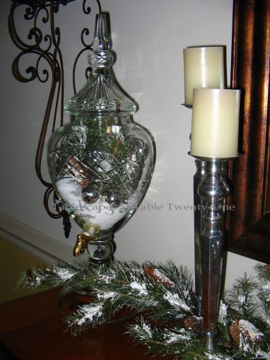 The buffet decor mimics that of the dining table with snowy faux greenery, pine cones, more jingle bells, and lots of sparkle. The glass Parisian decanter is filled with “snow” and greenery, and a length of brown satin ribbon literally “ties” the dining room in with decor in the foyer.