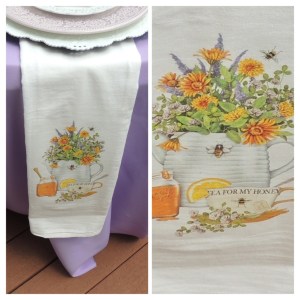 “Honey Bee Tea”, Tablescapes at Table Twenty-One, www.tabletwentyone.wordpress.com – Ladies tea on the deck in lavender and white. Mary Lake-Thompson flour sack towel, “Tea for my Honey”