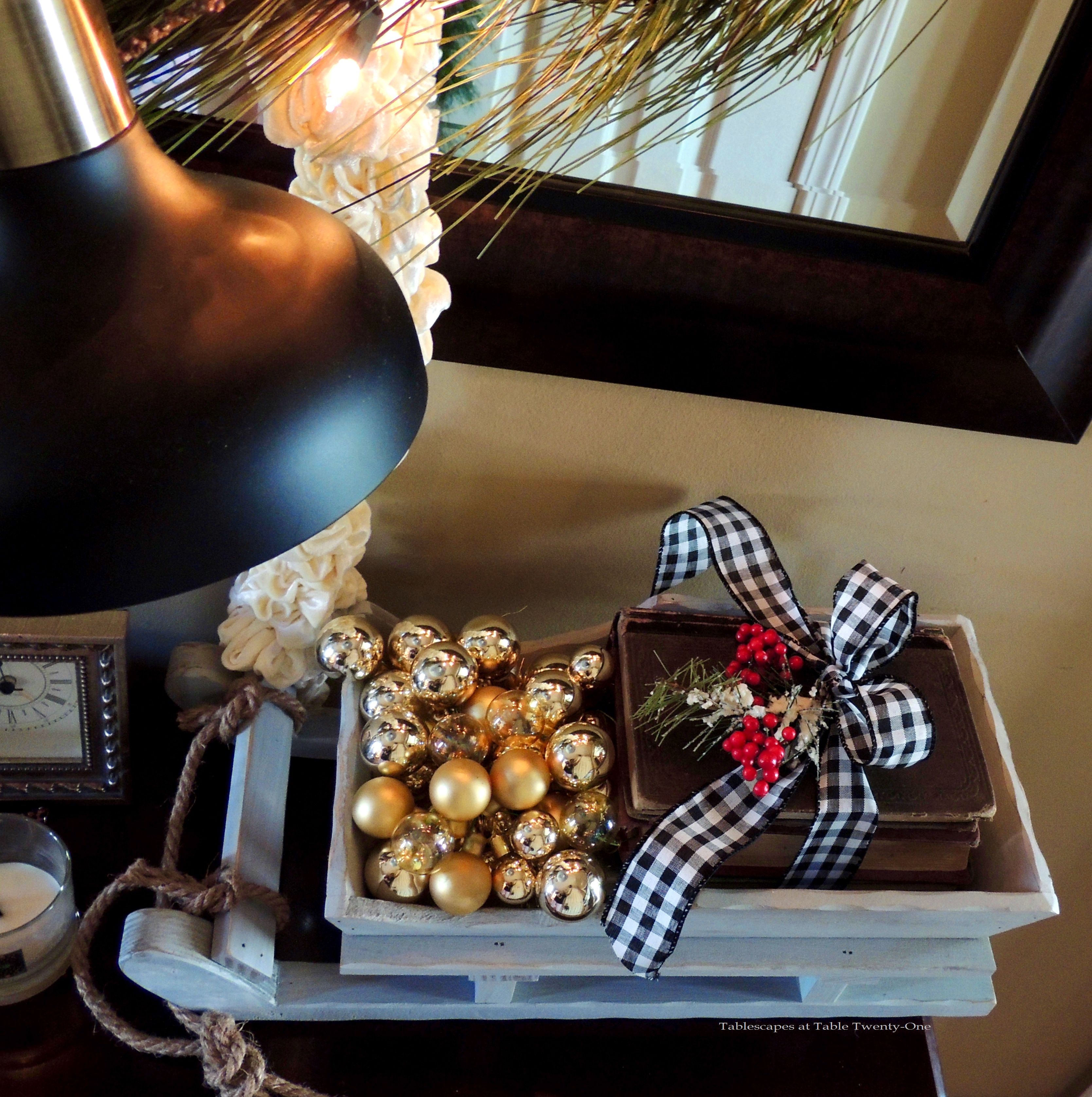 “Better Late Than Never – Christmas 2016 Foyer & Library”, Tablescapes at Table Twenty-One, www.tabletwentyone.wordpress.com – Wooden sled filled with gold balls, vintage books tied with black & white checked ribbon