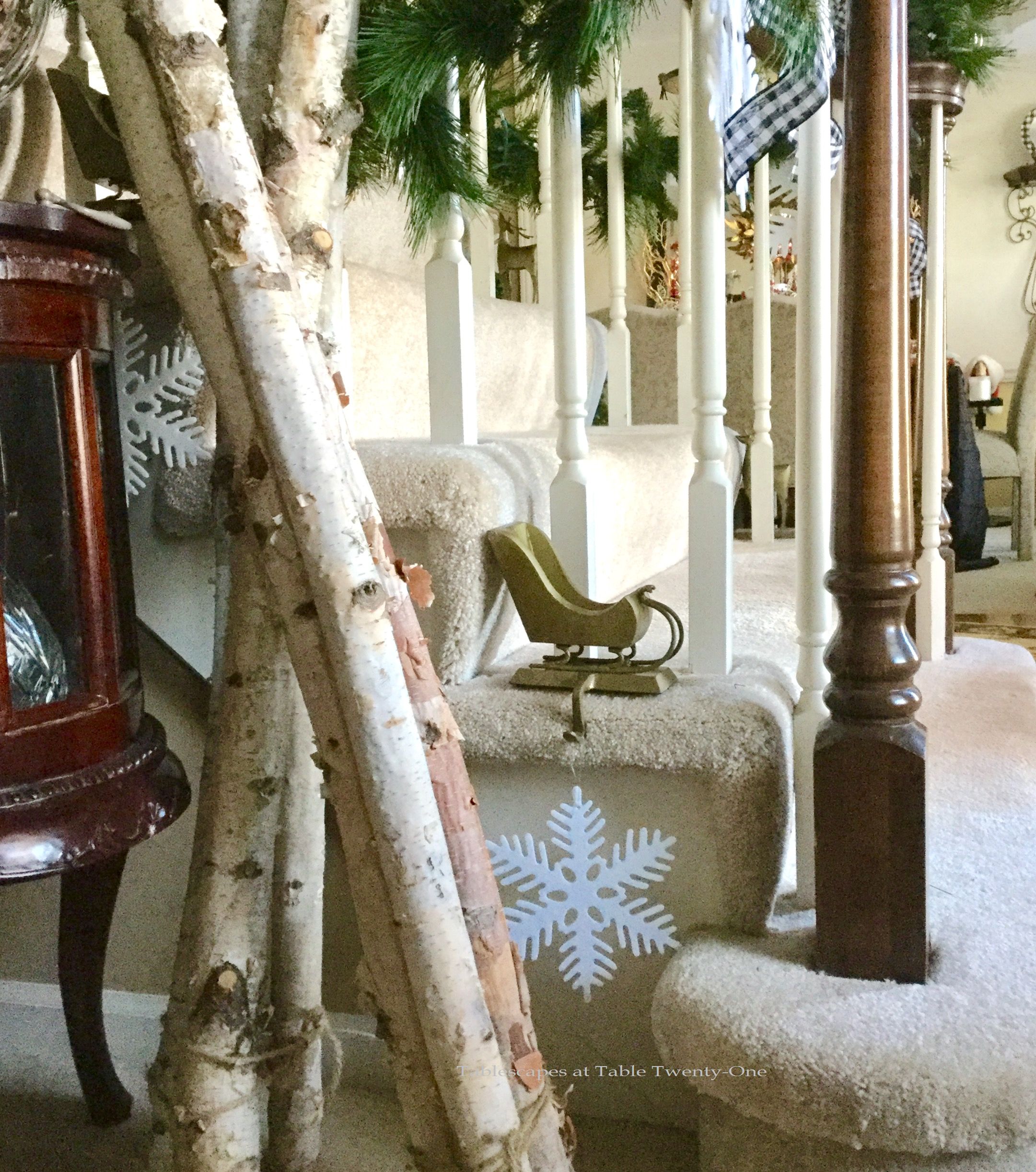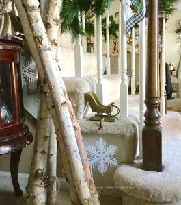 “Better Late Than Never – Christmas 2016 Foyer & Library”, Tablescapes at Table Twenty-One, www.tabletwentyone.wordpress.com – Gold sled stocking holder from Pier 1 with snowflake