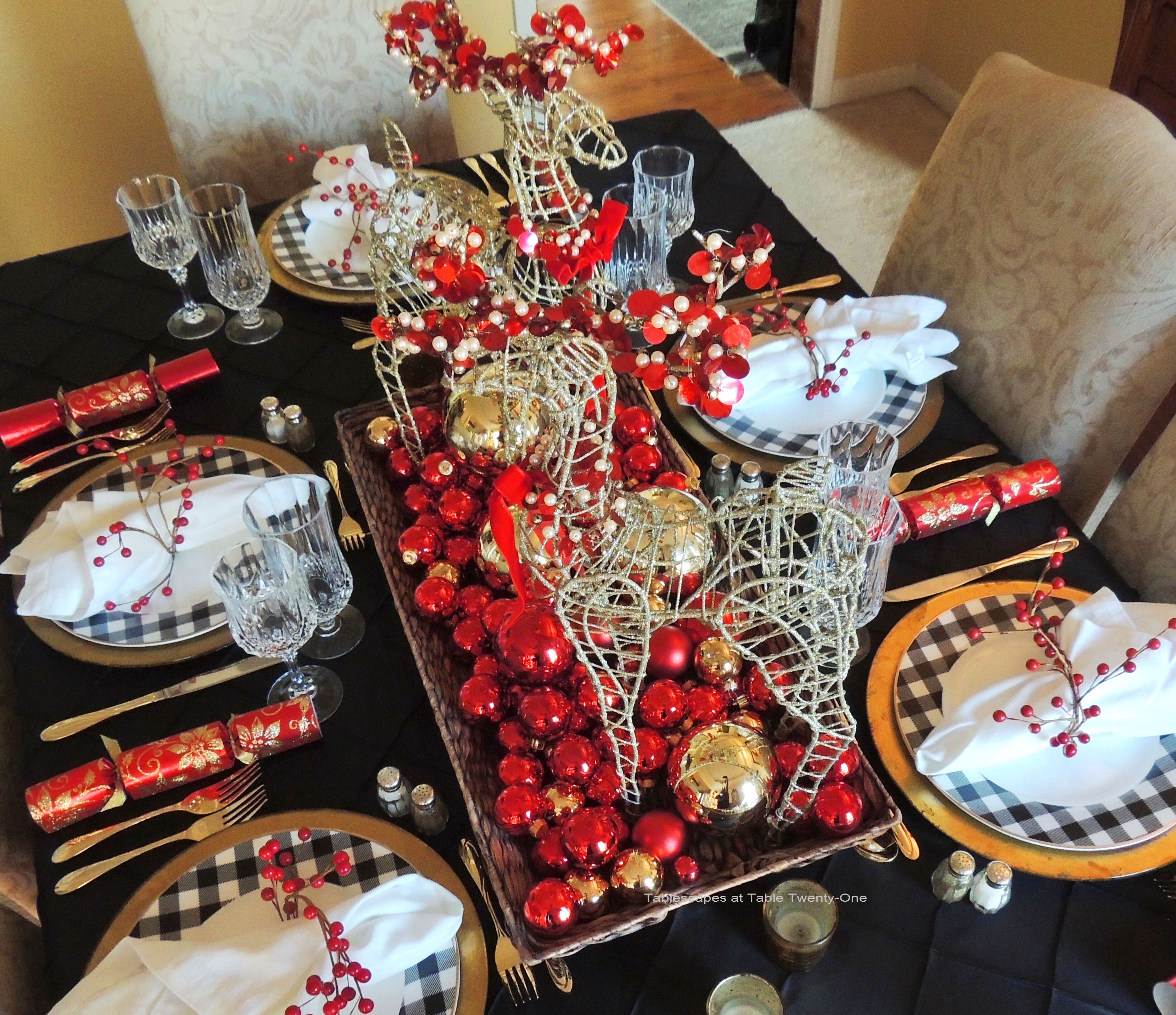 Tablescapes at Table Twenty-One, www.tabletwentyone.wordpress.com, “Better Late Than Never, Part II – Christmas 2016 in the Dining Room” – Centerpiece created in low, flat basket with Pier 1 gold reindeer frolicking in mounds of red and gold glass ornaments