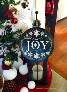 Tablescapes at Table Twenty-One, www.tabletwentyone.wordpress.com, “Better Late Than Never, Part II – Christmas 2016 in the Dining Room” – Lantern and faux snowballs under Christmas tree