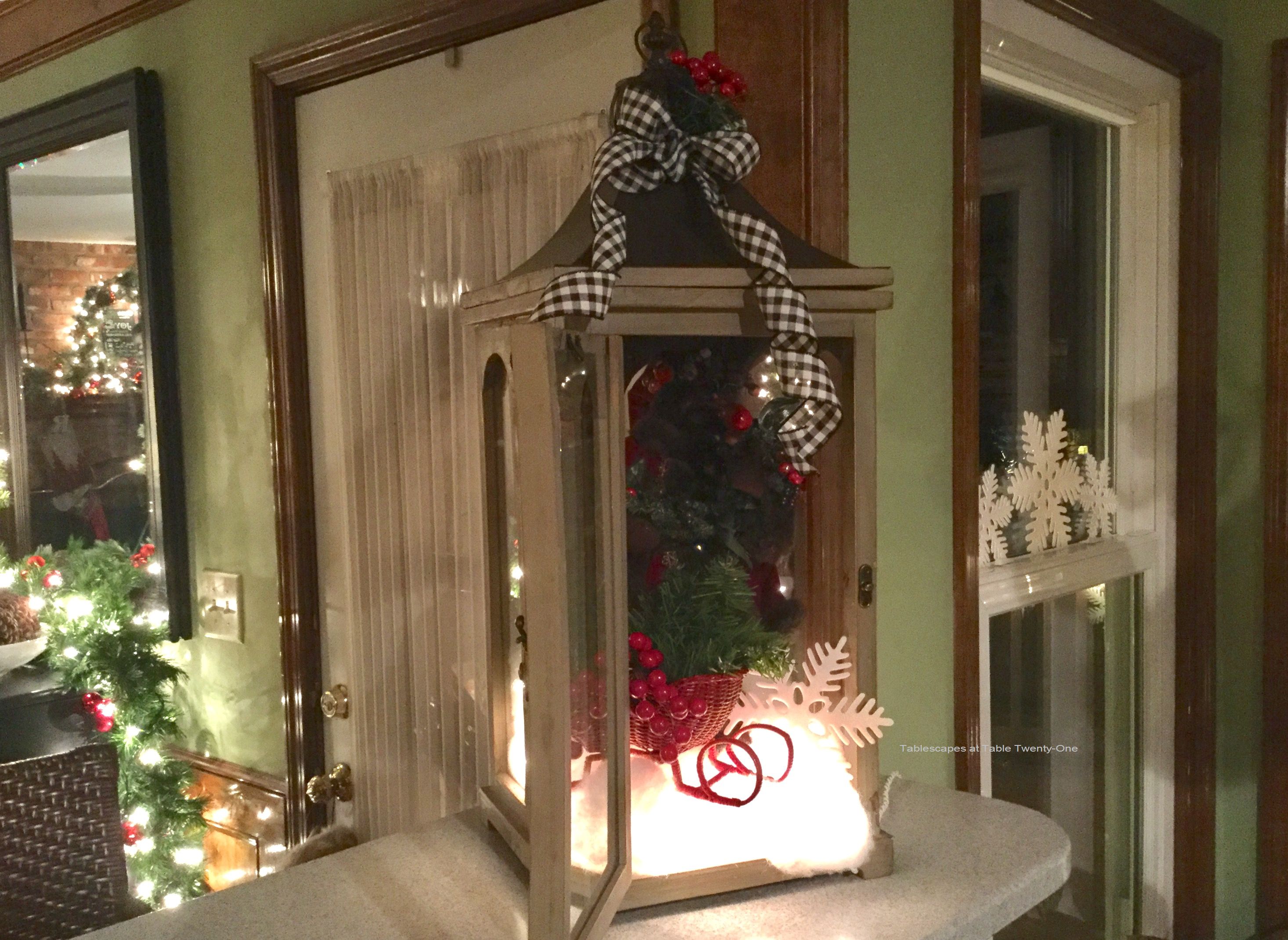 Tablescapes at Table Twenty-One, www.tabletwentyone.wordpress.com, “Better Late Than Never, Part IV/Final Chapter – Christmas 2016 in the Kitchen” – Lantern on bar with Santa & sleigh