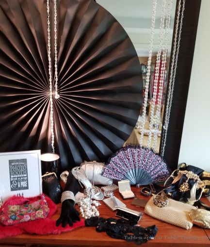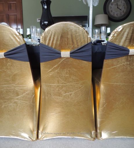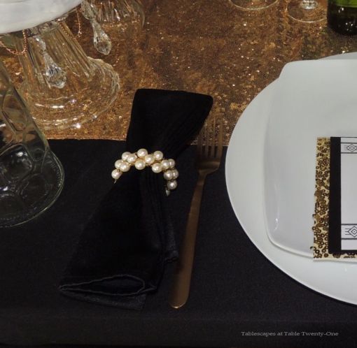 We transformed the family room into a 1920s era fine dining establishment complete with a 1920s music playlist in the background. It didn’t take long for me to know what linens I’d use from my stash. The palette of the Gatsby era was gold, black & white. I layered floor-length (90″x132″ for 6’x30″ folding tables) black linens from LinenTablecloth.com with gold sequin runners from YourChairCovers.com. The chairs clean up nicely with gold stretch leather-look covers (no longer available where I bought them, but I’ve seen them at TableclothsFactory.com) with black spandex sashes and sparkly gold slips (YourChairCovers.com).
