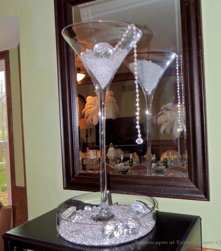 Other special touches around this room included another ostrich feather lamp I created using a crystal candlestick, an abundance of paper rosettes (Michaels) mixed with oversized champagne glasses of crystals and pearls, and an extra tall martini glass (Hobby Lobby) that I placed in a large flat glass bowl to give it girth. Final touch: notice a muted television in the background playing “The Great Gatsby” movie!!!
