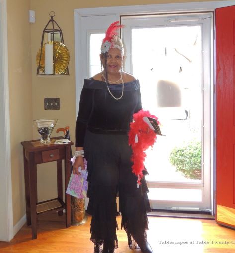 The candy bar in the dining room was one of my favorite elements to create! I researched candies and gums that were popular in the 1920s and then went on the hunt. The result: a favor bar laden with 22 flavor treats served up in various size martini and pilsner glasses!!! Guests scooped up what they wanted into favor bags with black, gold and/or white twist ties displayed in my Limoges swan salt & pepper cellars. The table is covered in another gold crinkle taffeta cloth with a black sequin runner. The gold painted manzanita “trees” just seemed to work with the decor, especially dressed in large hanging crystals. My generous neighbor provided the sequined dress for the dress form, and I finished it off with a few ostrich feathers, a feather boa, and all the remaining pearl necklaces from my jewelry collection!