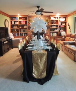 “Ain’t Misbehavin’” – Celebrating Mom’s 89th Birthday Gatsby-Style”, Tablescapes at Table Twenty-One, www.tabletwentyone.wordpress.com – Dining table for 12 in art deco gold, black & white with ostrich feather centerpiece and sequin runner
