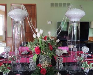 “Diamonds Are A Girl’s Best Friend – 60th Birthday Ladies Luncheon”, www.tabletwentyone.wordpress.com – Ladies luncheon in pink black & white with glamorous Marilyn Monroe/Gentlemen Prefer Blondes vibe – Centerpiece with crystal garland