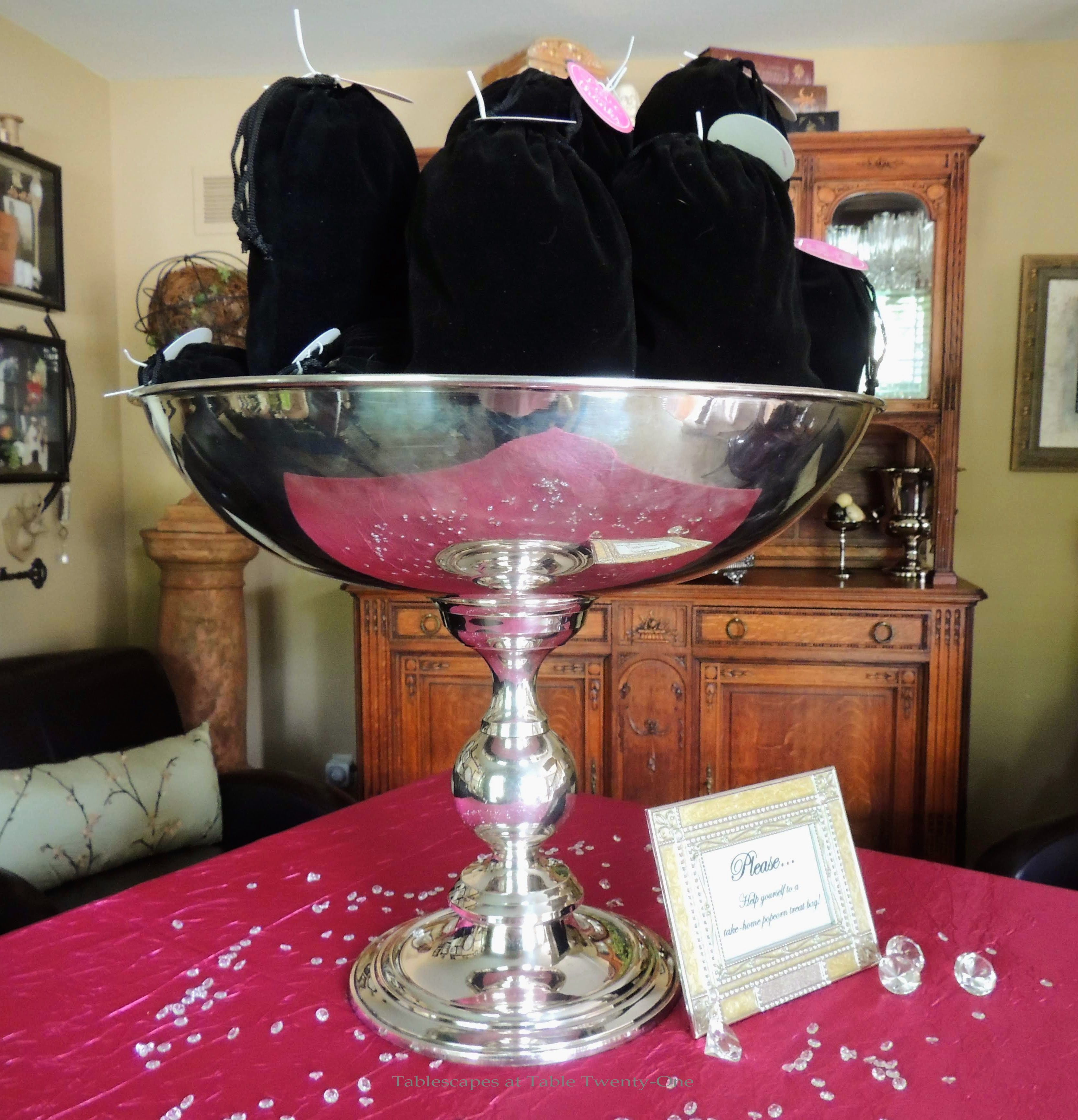 “Diamonds Are A Girl’s Best Friend – 60th Birthday Ladies Luncheon”, www.tabletwentyone.wordpress.com – Ladies luncheon in pink black & white with glamorous Marilyn Monroe/Gentlemen Prefer Blondes vibe – Black velvet favor bags of popcorn in silver compote