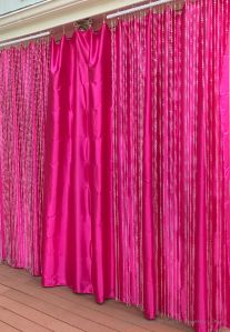 “Diamonds Are A Girl’s Best Friend – 60th Birthday Ladies Luncheon”, www.tabletwentyone.wordpress.com – Hot pink satin drape with crystals in front for a glamorous Marilyn Monroe/Gentlemen Prefer Blondes vibe