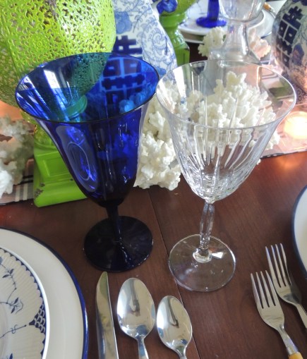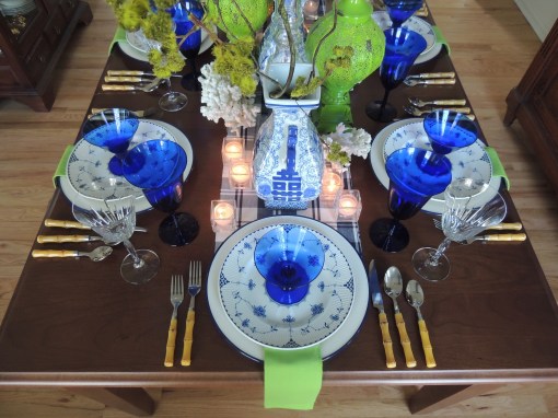 I don’t think I have EVER used these Johnson Brothers “Blue Denmark” dinner plates in the 10+ years I’ve had them! They work perfectly with the beautiful yet sturdy cobalt blue-rimmed ceramic chargers I found on clearance a couple of years ago at Hobby Lobby. Centered on each plate is a cobalt short martini glass from Pier 1 in their heyday. A lime green cotton napkin adds a shock of unexpected color.