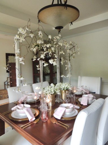 “Coquettish” is definitely not a word you often hear, but very appropriate for this stylish and girly table. The florals in the tower vases are so pretty and a reminder that I have these vases in some nook and cranny. The pink tumblers from Michaels were a great find and the dessert and coffee service is a great addition to this elegant table. Gotta love Nell Hill’s!!
