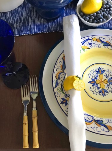 I love the very European design on the plates! These lemon napkin rings around plain white hemstitch napkins work well with the design rather than competing for attention. Faux bamboo flatware with a yellowish undertone easily slips right in for a polished look.
