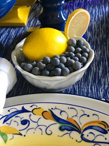 Blue and yellow, a favorite combination of mine. It’s great to add in the lemons and blueberries. Fun European design in those plates.