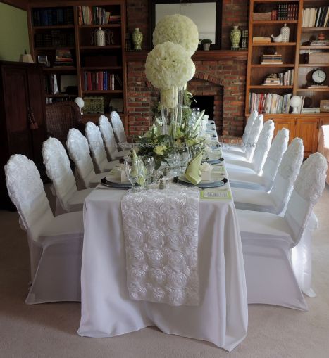 We transformed the family room into a 1920s era fine dining establishment complete with a 1920s music playlist in the background. It didn’t take long for me to know what linens I’d use from my stash. The palette of the Gatsby era was gold, black & white. I layered floor-length (90″x132″ for 6’x30″ folding tables) black linens from LinenTablecloth.com with gold sequin runners from YourChairCovers.com. The chairs clean up nicely with gold stretch leather-look covers (no longer available where I bought them, but I’ve seen them at TableclothsFactory.com) with black spandex sashes and sparkly gold slips (YourChairCovers.com).