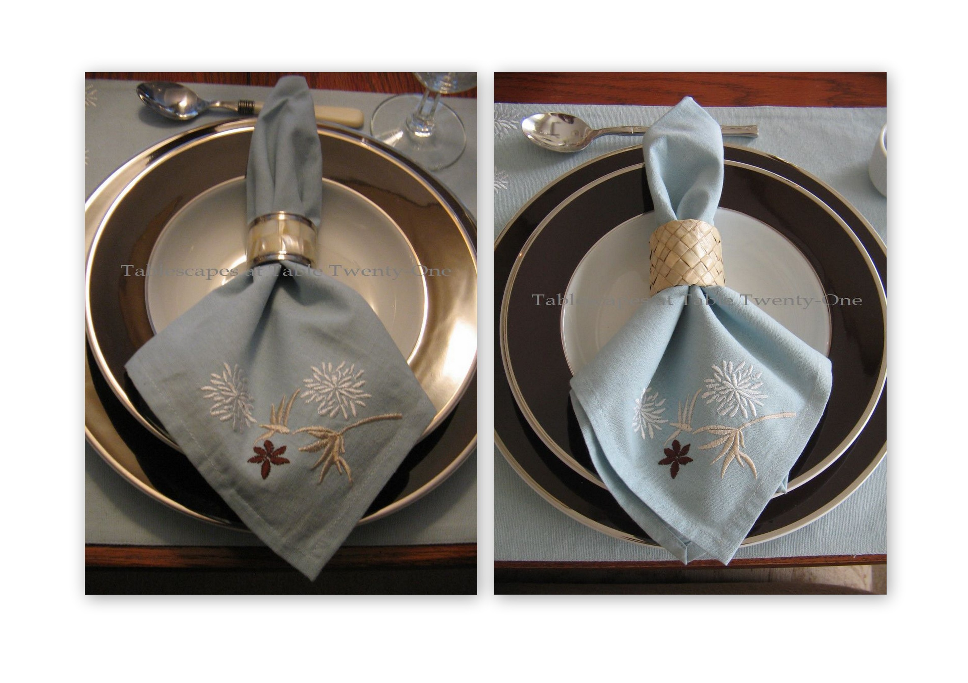 Making the napkin look a little different is as easy as changing the napkin ring. The napkin on the left has a silver-rimmed faux mother of pearl ring (I bought them at