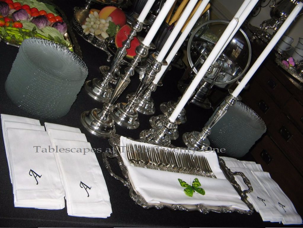 IMG_0620WMI considered what I wear when I’m looking to convey sleek sophistication, and nothing fills that bill like a little black dress! So the table is dressed in a sultry black linen.