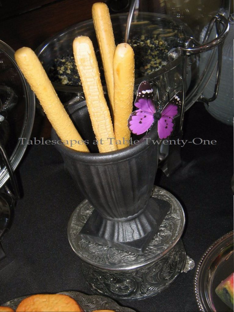 IMG_2818WMThe use of clear glass and black tabletop accessories further lends to the ethereal “floating” effect. You can pick up clear glass dishes at places like Bed Bath & Beyond or Old Time Pottery. The black stemware used here is just $1 a stem at the Dollar Tree store. Gotta love that place! Lots of bang for the buck…especially in this economy!!!