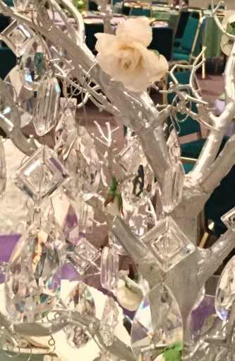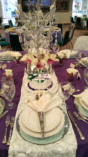 We didn’t have a lot of time to get pics, but this is the dining room seating area. (Because ALL but one of the invited guests accepted, I had to create 2 separate-but-complementary dining environments.) This table is draped in a black crinkle taffeta tablecloth with a silver sequin runner, “diamond” sash, pink ribbon, and mirrored trays beneath the centerpiece of tall gooseneck vases visually joined by a garland of crystal and lots of flowers in faceted vases. (I created 19 total fresh flower arrangements!!!) The buffet behind the table is similarly dressed with another jewelry display. My sweet friend, Cindy, was so gracious as to lend me chiavari chairs for this room which I tied in with the other room by threading through a pink crinkle taffeta sash with a “diamond” cuff. I found the cute poodle art on the sconces on clearance at…you guessed it!…Hobby Lobby. Some may remember the poodle from “French Poodle“, the jewelry display pieces from “Breakfast at Tiffany’s“, the mirror treatment from “Ain’t Misbehavin’ – Celebrating Mom’s 89th Birthday Gatsby Style“, the Princess In Pink signage from “Princess Pink Birthday“, and the faceted & mirrored centerpiece trays from “Happy Birthday, Barf!“.
