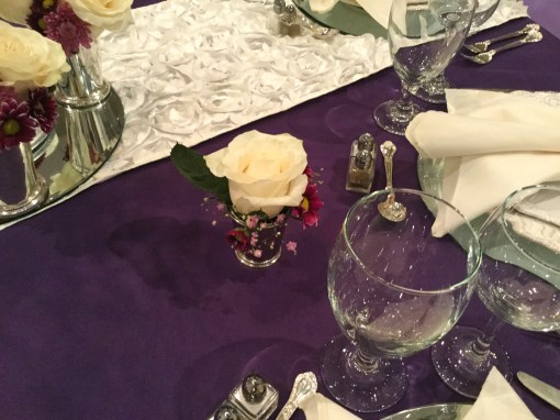 …and the take home favors of assorted popcorn flavors from Popcorn Heaven tucked into black velvet bags and prominently displayed in a large silver compote! (Variations of the compote are at “Finally Fall“, “Cranberry Christmas – Square“, “Cranberry Christmas – Long Table“, and “Roses In October“.)