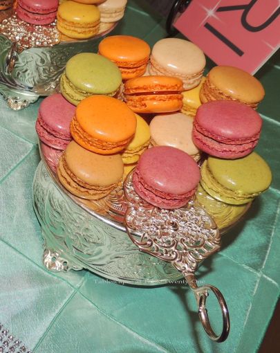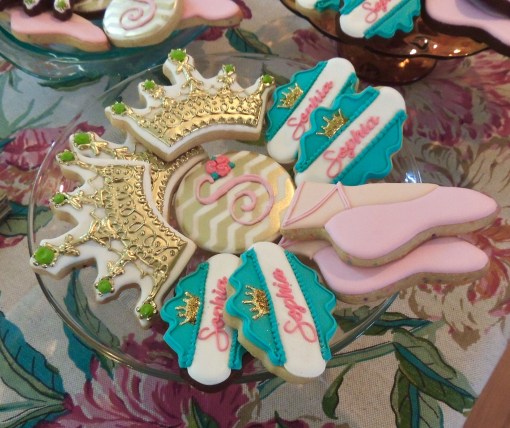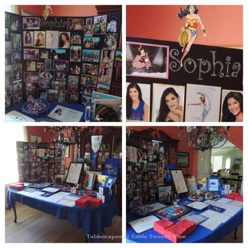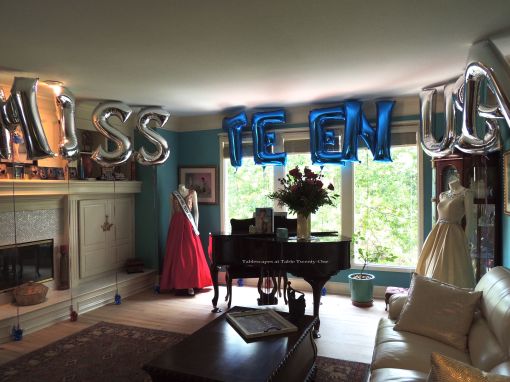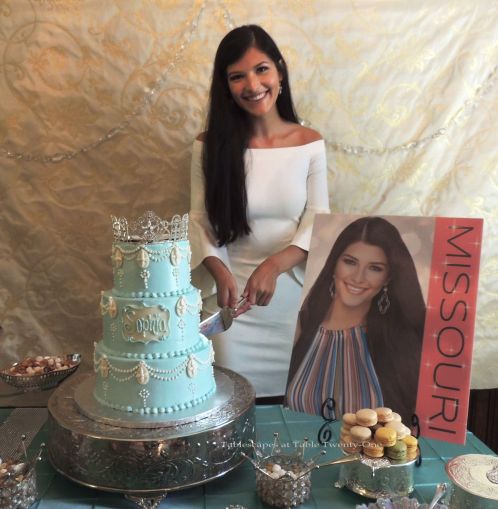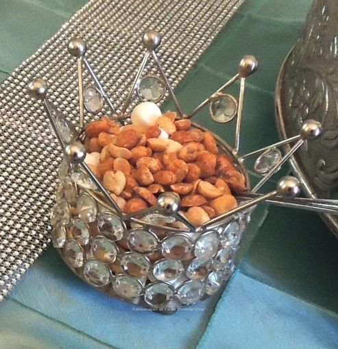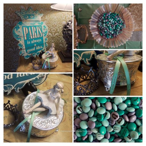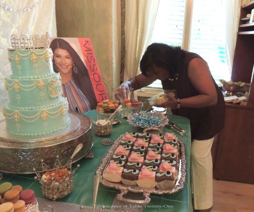 Upon entering, the ladies were greeted with 2 WAY oversized hot pink balloons that were originally intended for a display at the end of the driveway. It was so hot & humid, however, I opted to just put them inside so they wouldn’t wilt. The telephone table on the other side was decorated with a “diamond-dotted” rose ball atop a facted pillar. (I’ve done these before for “Should Have Put A Ring On It“.) The foyer table was draped in a “diamond” sash with a pink ribbon accent. I created a Harry Winston/Tiffany’s-inspired window display on the table for dramatic effect. On the walls were pink and black crowns I bought on clearance at Hobby Lobby years ago but have never used. (Another jewel-inspired post worth checking out is “Diamonds Are A Material Girl’s Best Friend“)