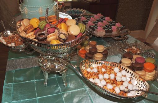My wonderfully talented friend Patrick created the glitzy almond-vanilla cake that I further decorated with a couple of the same brooches as used on the menus. (We also served my famous carrot/”karat” cake for the occasion!)