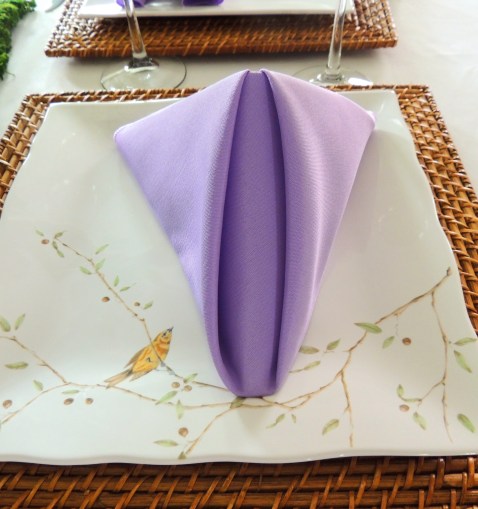 I’ve not used these beautiful Pier 1 plates since 4 years ago when I posted a piece called “The Bluebird Special“. While certainly far from what might be construed as traditionally formal, they have a simultaneously staid/laid back look. The woven square chargers and faux bamboo flatware lend texture and an organic feel to the place setting.  The yellow undertones of the flatware complement the bird on the plate as well as the floral centerpieces. The lavender napkin is fashioned in a traditional pyramid fold, and the green goblets are from Dollar Tree.