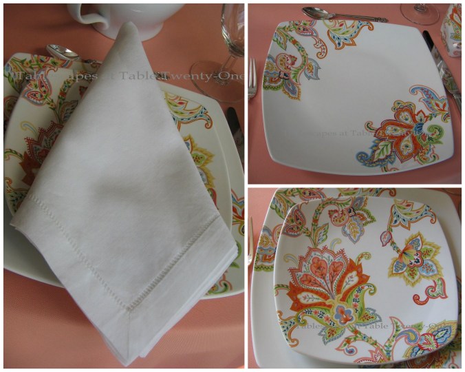 I found the most beautiful kitchen dishes this past Christmas season at Home Goods! Our kitchen motif is a mix of black & white checks and toile, so these Ciroa “Buffalo Check” dishes are my new favorite. They made an easy transition out to the deck! The napkins, purchased at Tuesday Morning, are actually kitchen towels that I like to use as napkins. The barnyard motif of a steer, lamb, pig, and rooster make them perfect for this country-/farm-inspired tablescape.