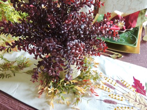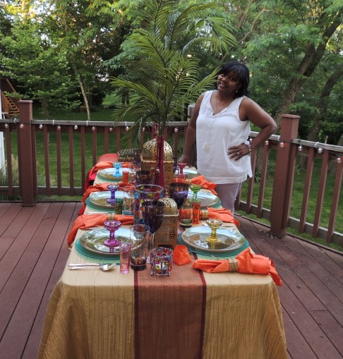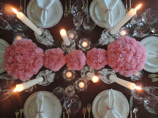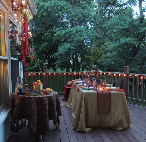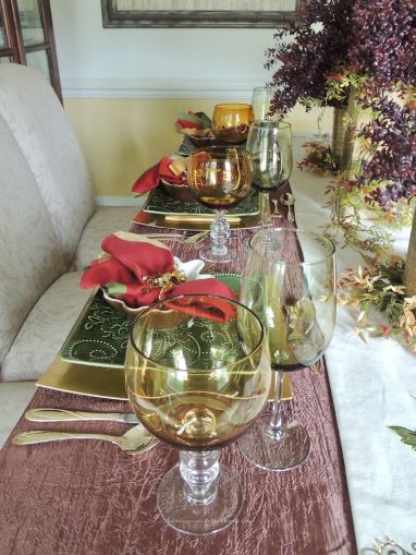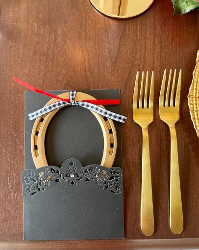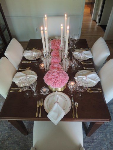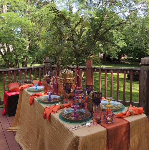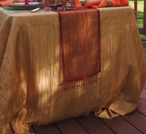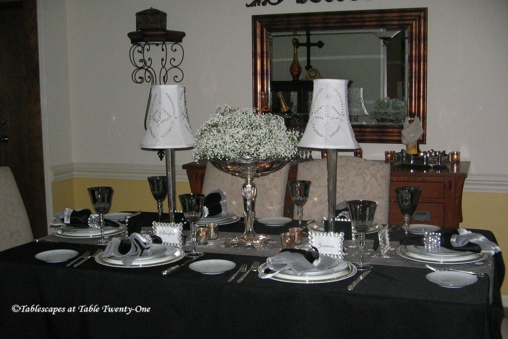 We transformed the family room into a 1920s era fine dining establishment complete with a 1920s music playlist in the background. It didn’t take long for me to know what linens I’d use from my stash. The palette of the Gatsby era was gold, black & white. I layered floor-length (90″x132″ for 6’x30″ folding tables) black linens from LinenTablecloth.com with gold sequin runners from YourChairCovers.com. The chairs clean up nicely with gold stretch leather-look covers (no longer available where I bought them, but I’ve seen them at TableclothsFactory.com) with black spandex sashes and sparkly gold slips (YourChairCovers.com).
