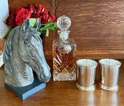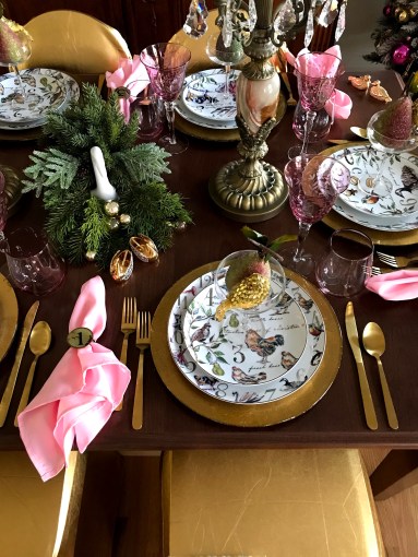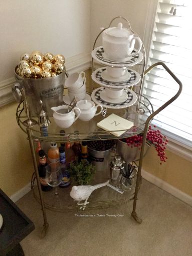 Our modest entry hall sets the tone for thumbing our noses to Prohibition with the oversized champagne flutes! They’re filled with tiny crystals. (Crystals…Cristál…the champagne…get it?) On the walls are cute Rosanna cocktail plates I bought a few years ago for cocktail parties that were first used for “Hooray for Vodka!” back in 2013! (Smaller plates of this same design were used to serve the birthday cake!)