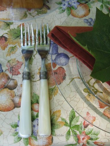 To avoid monotony, add an unexpected but coordinating color in either tiny bits or in one big wallop. Here, a cake plate stacked high with bright green Granny Smith apples in the dead center of the table does the trick. Decorating with fruit is an easy and cost effective way to add color, texture and contrasting shapes to your tablescape.