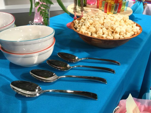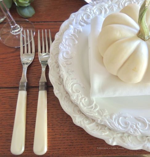 I chose 222 Fifth “Holiday Wishes” dinnerware for the shoot because of its lavish design. (See this same dinnerware at “Cardinal Christmas” from 2016.) The napkins are tied with red ribbon to mimic the design in the dishes.
