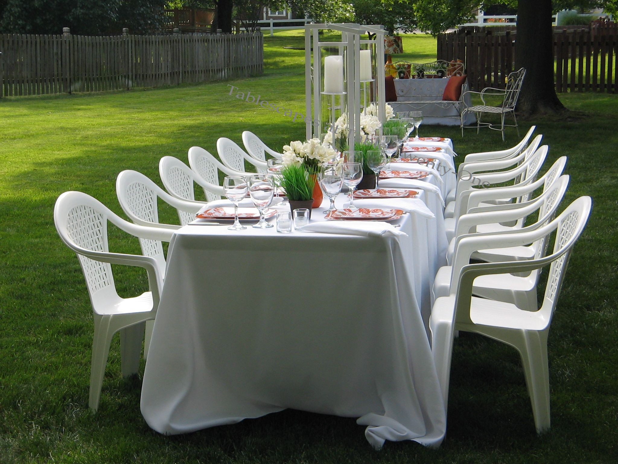 I gave chairs a ghostly look by covering them with oblong table linens. The same effect can be achieved with queen- or king-sized bed sheets.