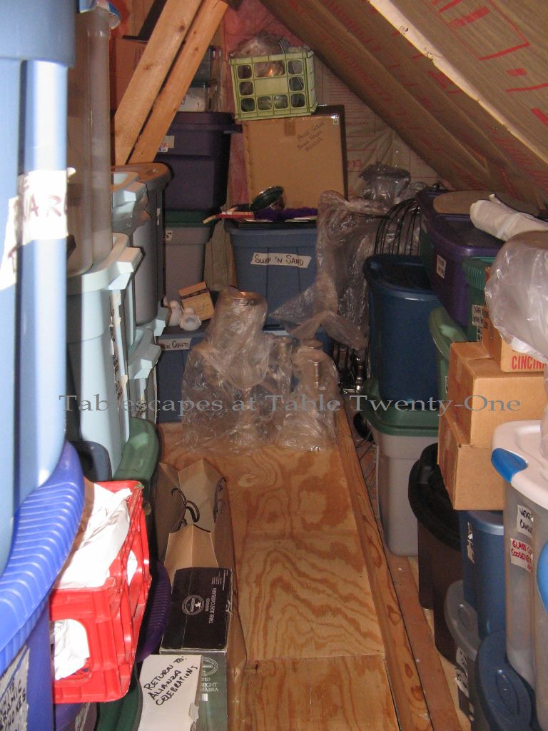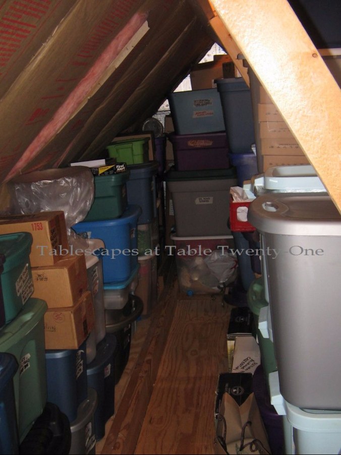 Beyond a door that appears to be a closet in my dressing room is an attic space built on in 2009. It was supposed to double as a safe room, but there’s nothing safe going on in here, that’s for sure!!! 🙂 It’s not heated or cooled, so I have to really pick & choose my times to access items from this space!