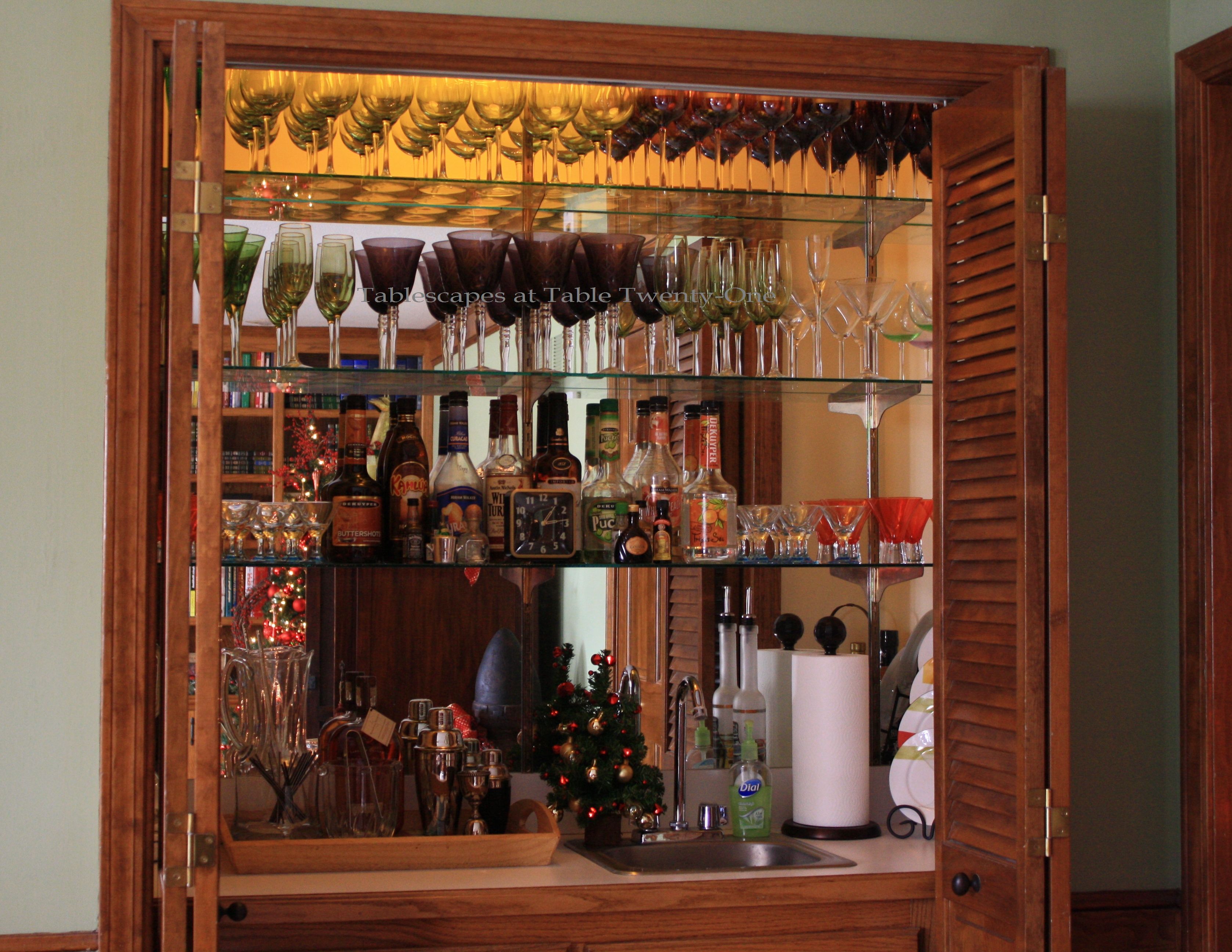 The area between our bedroom and my dressing room has lots of cabinet space for dishes and stemware!
