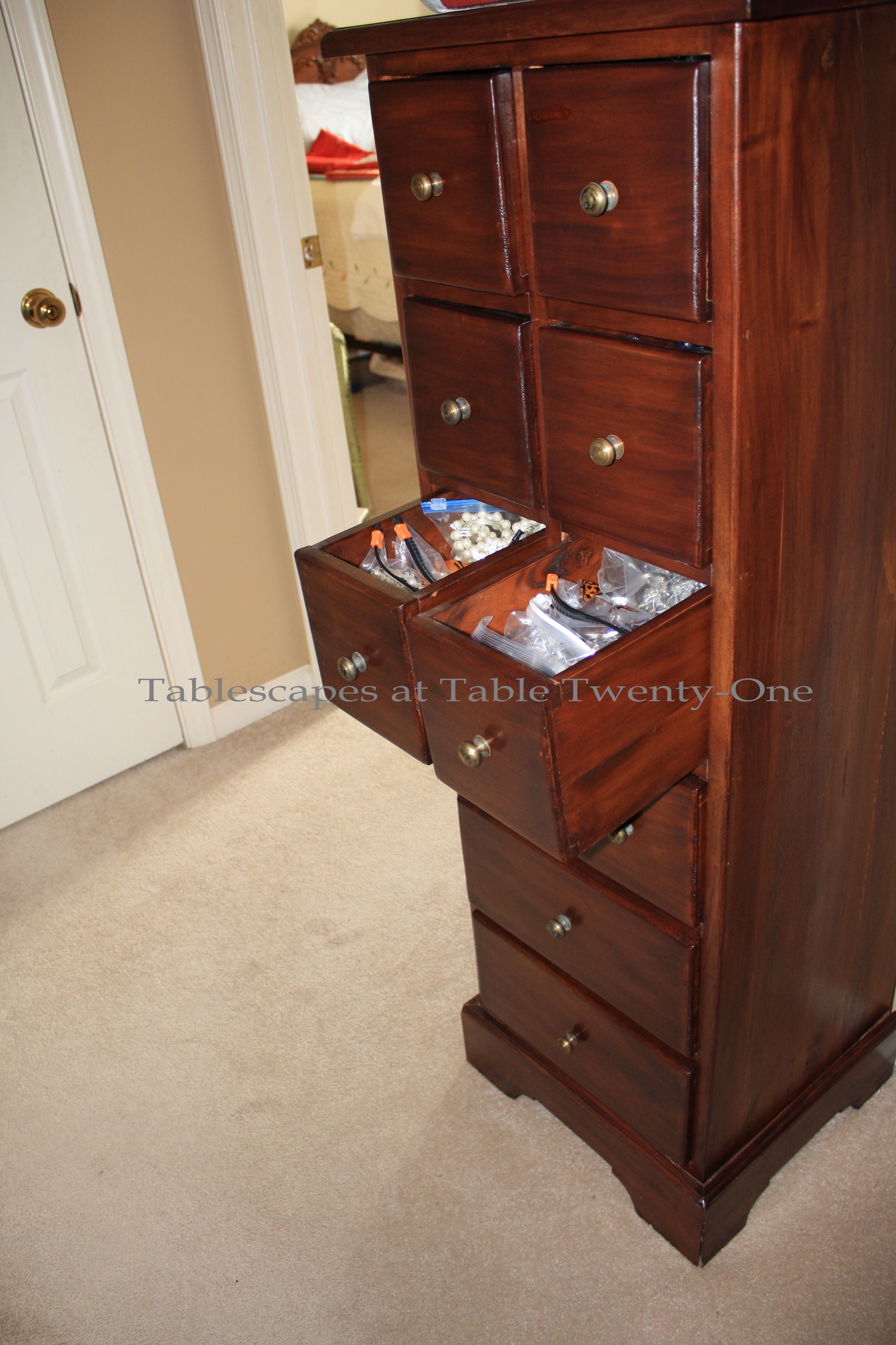Upon entering our home, there is storage right there in the foyer in the form of a 12-drawer upright apothecary cabinet. It hides scads of napkin rings tucked into Ziploc bags to keep them from tangling up.