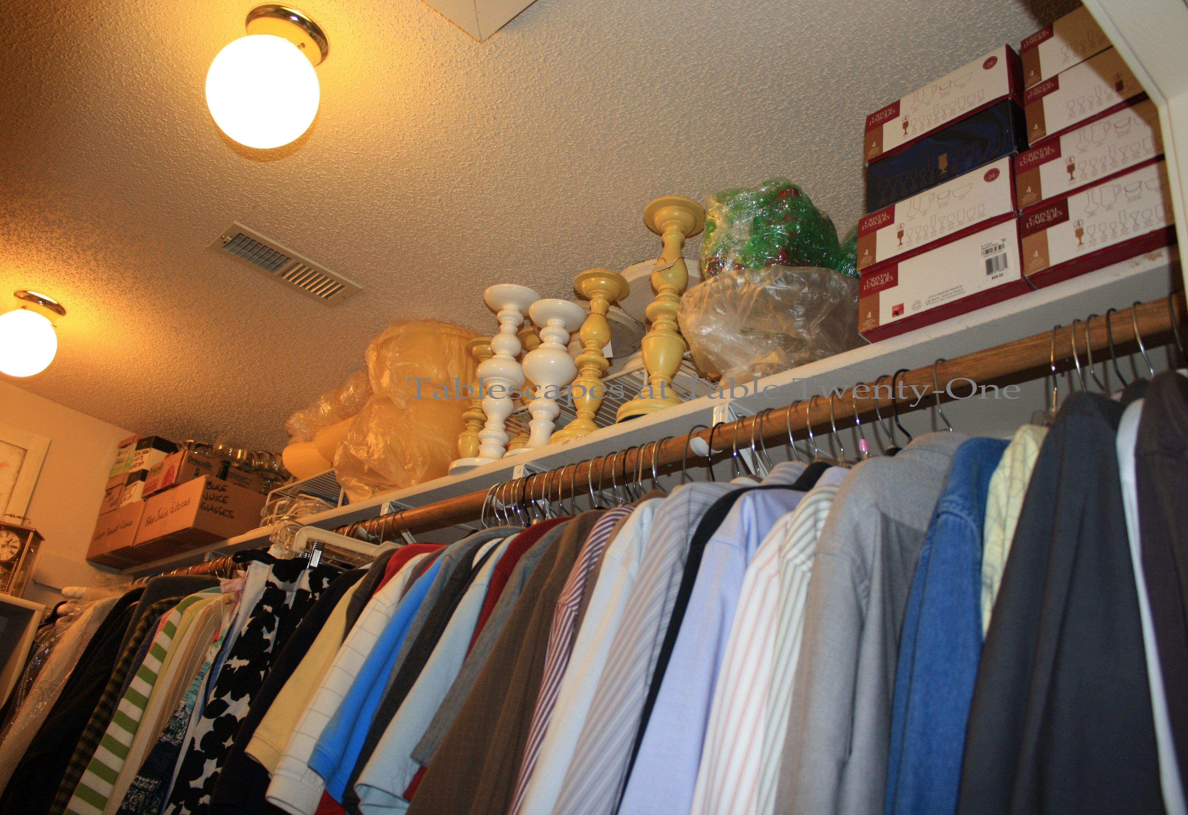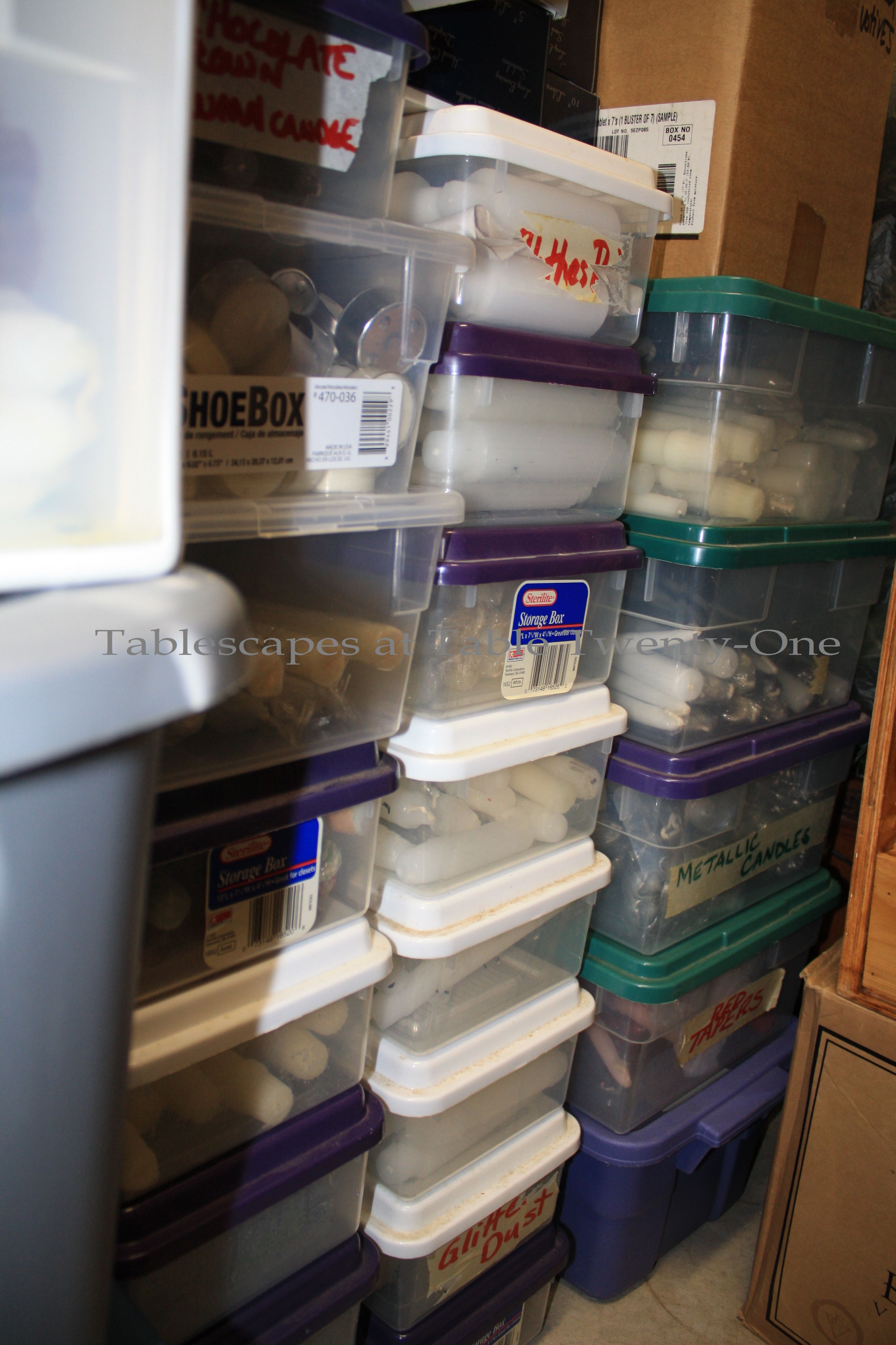 There’s NO WAY I could photograph my office in its current state!!! I have a lot of projects going on, and it’s a huge mess. There are, however, several bookcases and a table in there with floral vessels (all filled with faux flowers), cake plateaus, assorted figurines, and oversized LED candles. In my office closet, however, are 5 shoe hangers filled with hundreds of napkins. More napkins are stored in plastic drawers on the floor.