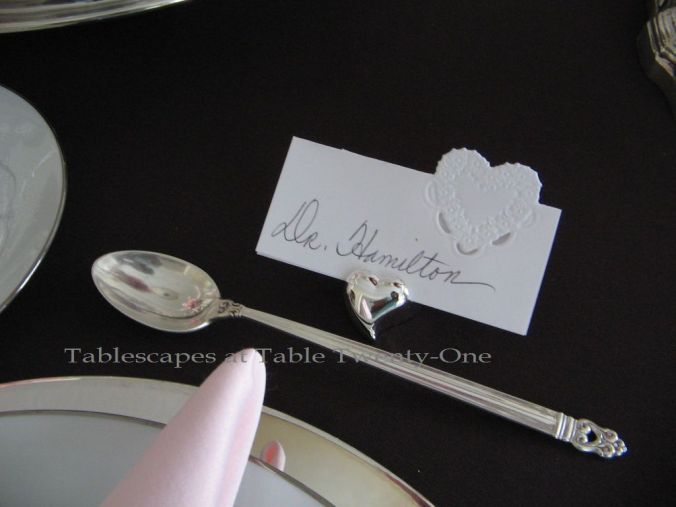 A silverplate charger and my sister’s Noritake “Whitebrook” china are topped with a simply folded pastel pink napkin from Bed Bath & Beyond. A small silver bell rests next to the hostess’s place setting. While it would normally be used to summon staff during dinner (as if I actually have staff! 🙂 ), this bell is to signal that it’s time for all the couples assembled at the table to steal a kiss!♥