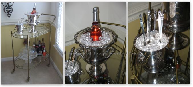 The corner tea cart, bought by my Mom in the 1950s from the swanky House of Modern and given to me a few years ago, is a handy-dandy extension of the buffet. A fun pink moscato is iced down in a silver champagne bucket, also given to me by my Mom. The salad course will be served with forks iced to perfection in this silver mini champagne bucket that is also perfect for a split of champagne if you’re dining alone! (Icing the fork tines is a great way to keep your salad greens crisp just a little bit longer, especially in summer! Just watch the look on your guests’ faces when the fork is presented like this! If you’re not lucky enough to have “staff”, the hostess should personally present the bucket for each guest to take a fork.) See another cool way to ice forks down by clicking HERE and scrolling down to Tip #3! This is also a fabulously fun & fancy way to present dessert forks or spoons!!!