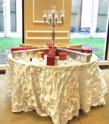 This was one of my favorite parts of the whole buffet tablescape! The drink station is set up on a wooden Lazy Susan for easy access. The wine glasses with purses all over them are from the Dollar Tree and complement the shoe wine glasses on the dining table. The stiletto heel bottle stoppers were an impulse buy from a Michaels clearance bin a couple of years back that really add style and a little shimmer. We were really pressed for time, and I asked my genius friend, Barbara, to figure out something to do with the shot glasses on the table. She stacked them pyramid style for a look that is a real winner! A+!!!!! (She’s a retired teacher!)