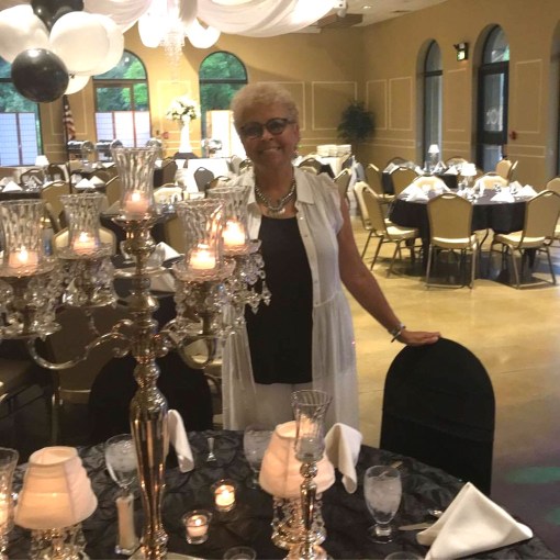Bright pink/fuchsia 17″ poly napkins from LinenTablecloth.com are neatly stacked at the end of the buffet table. The fun metal figurine in the background depicts a carefree young woman out on a shopping spree and is one of 3 purchased at Hobby Lobby a couple of years ago. The cake…well, you’ll learn more about that cake in the video clip at the end of the post!