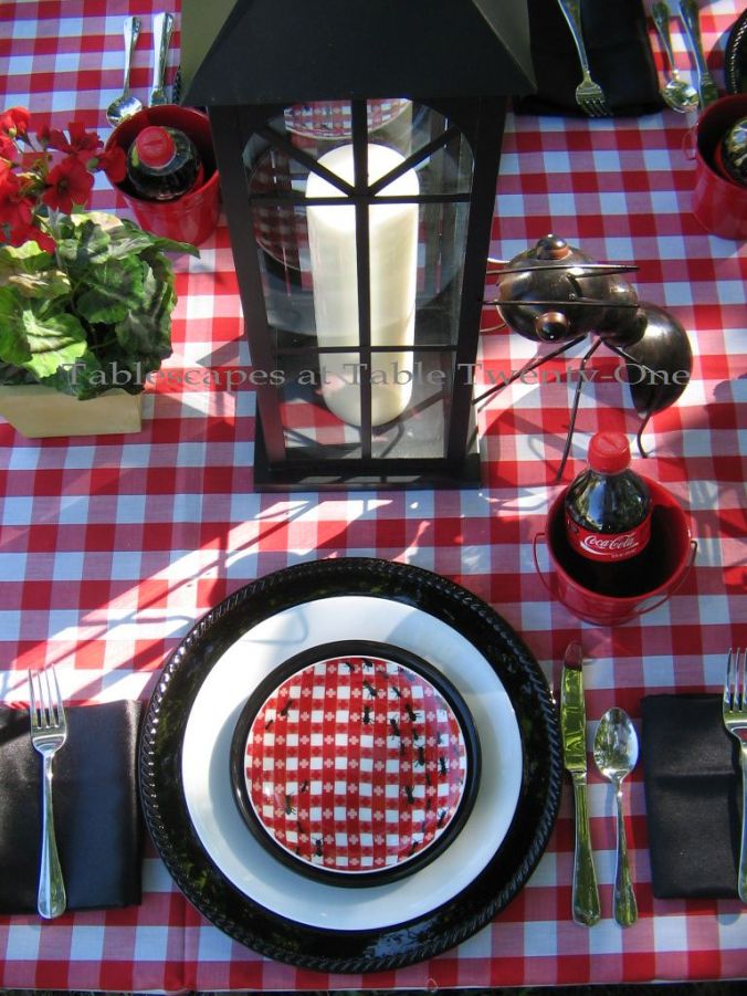 The place settings here are simple: a black dinner plate from Dollar Tree, a practically indestructible white Corelle salad plate, and a fun Pier 1 red & white checkered plate covered with ants to throw those rib bones on once they’re picked clean! (Kansas City is KNOWN for its fabulous barbeque, and no picnic is complete without a slab of meaty ribs!) Faux black bamboo flatware adds a touch of class to the setting, but fits right in with the natural vibe.