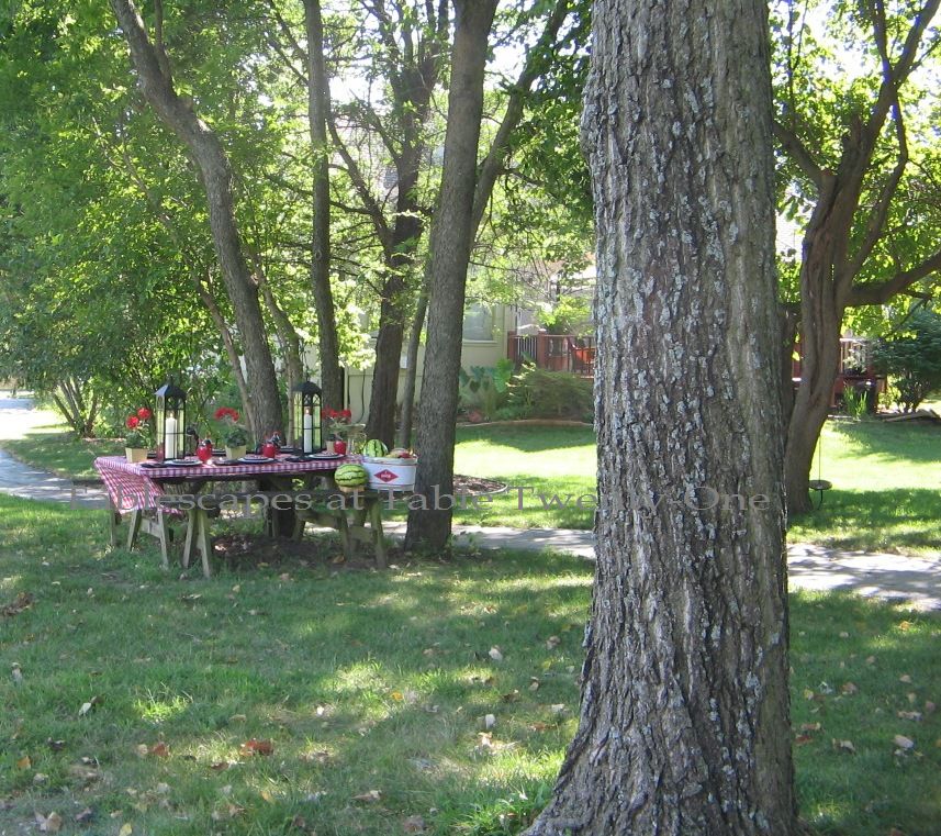Some readers may recall a tablescape (Ants In My Pants Picnic) I did on this same picnic table along the walking trail in our subdivision awhile back. (HUGE thanks to neighbors Lynn & Barbara for their help on this one!!!) Some of those same elements are used here, but in a different way. For starters, rather than covering the table with the red & white checkered fabric, it is folded and serves as a runner. (Note to my Art of Tablescaping Students…this is a great example of what we discussed about saving money by changing up the look without changing all the pieces.)