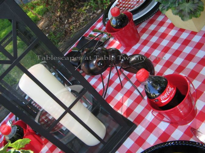 The main attraction is the Pied Piper-esque single-form line of metal ants down the center of the table. I bought the giant ones several summers ago at Hobby Lobby. The smaller ones were purchased at a wholesale place I frequent here in the Kansas City, Mo., area. As you will soon see, the parade of ants theme will carry out in other elements on the table. The checkered runner is topped with 3 watermelon slice placemats found in a clearance bin years ago.