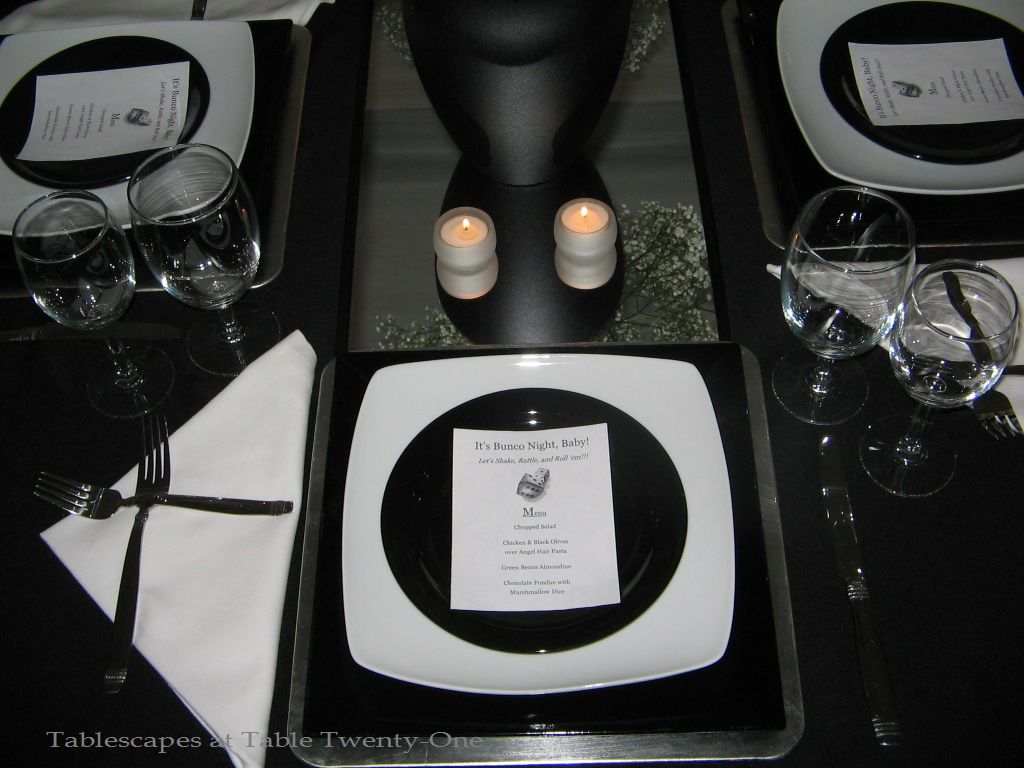We transformed the family room into a 1920s era fine dining establishment complete with a 1920s music playlist in the background. It didn’t take long for me to know what linens I’d use from my stash. The palette of the Gatsby era was gold, black & white. I layered floor-length (90″x132″ for 6’x30″ folding tables) black linens from LinenTablecloth.com with gold sequin runners from YourChairCovers.com. The chairs clean up nicely with gold stretch leather-look covers (no longer available where I bought them, but I’ve seen them at TableclothsFactory.com) with black spandex sashes and sparkly gold slips (YourChairCovers.com).