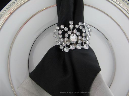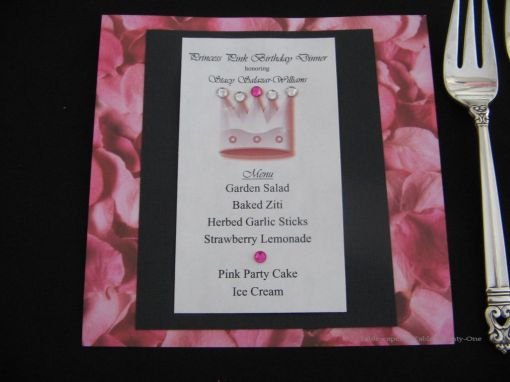 Each place setting starts with a silverplate charger and platinum-rimmed Noritake “Spectrum” dinner and salad plate. A soft pink, simply folded napkin from Bed, Bath & Beyond sits atop the plates. I created the menus on our home computer and gave them more of a 3-D look by adding an actual ribbon dotted with a pink gemstone. (The menu items were our actual dinner that night. You can find my recipe for the chicken pot pie on this site under Recipes. The cake is a wonderful recipe from Kitty’s Kozy Kitchen, and it is decadently delicious!!!)